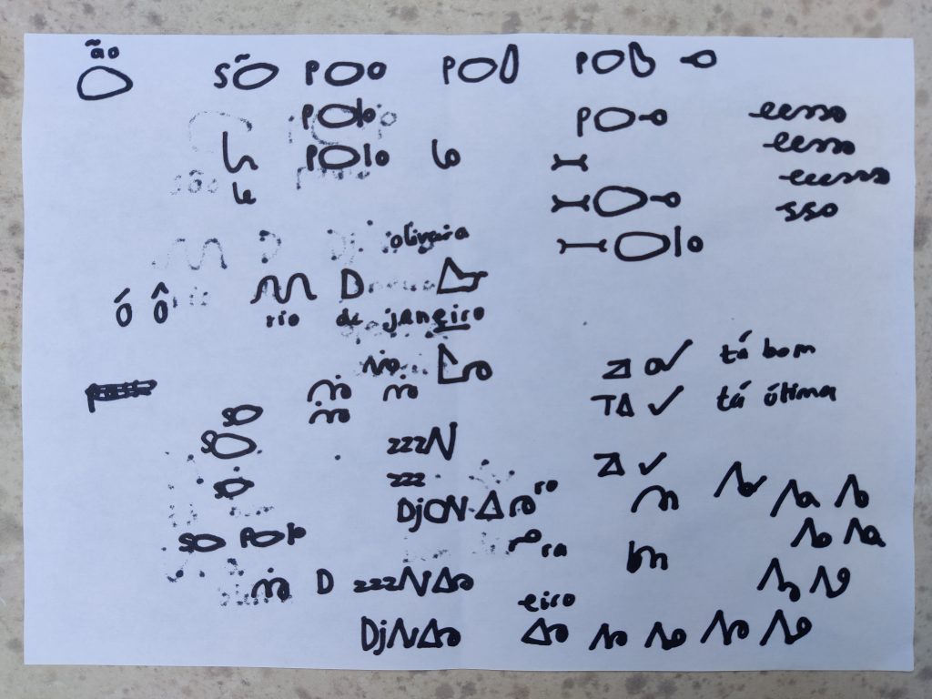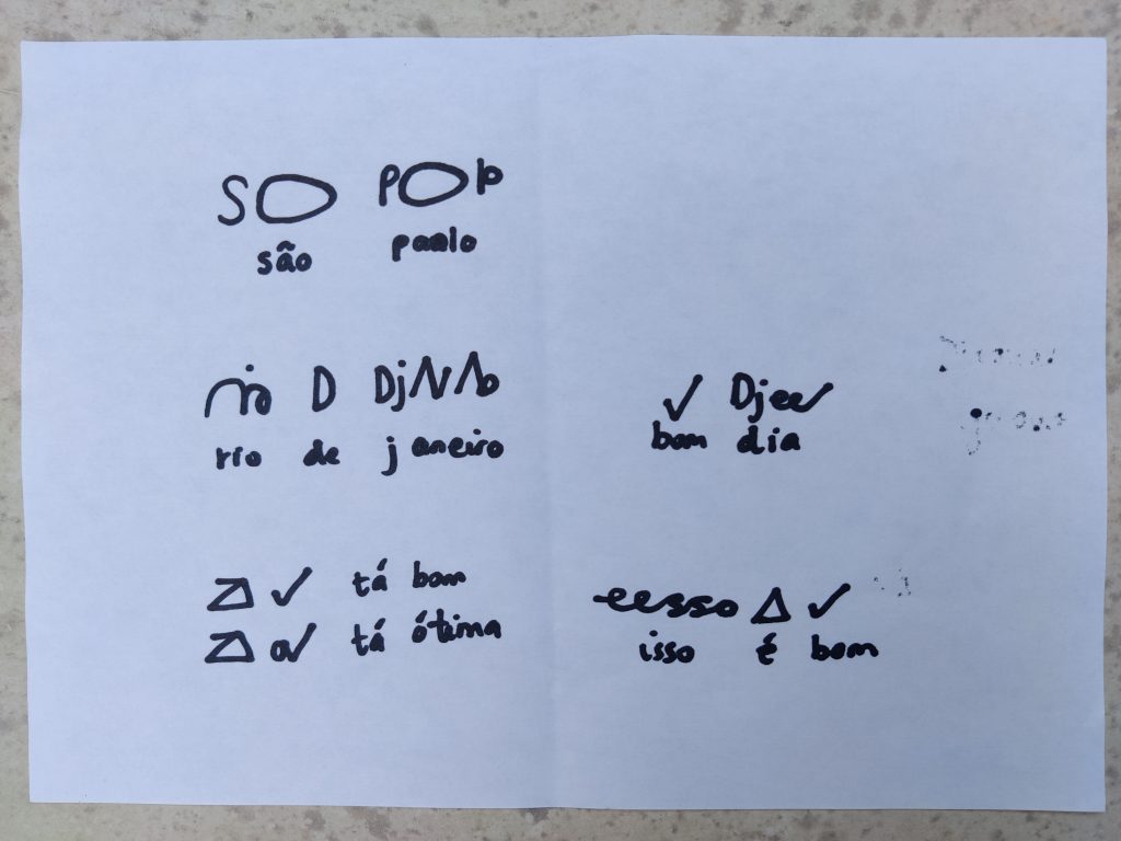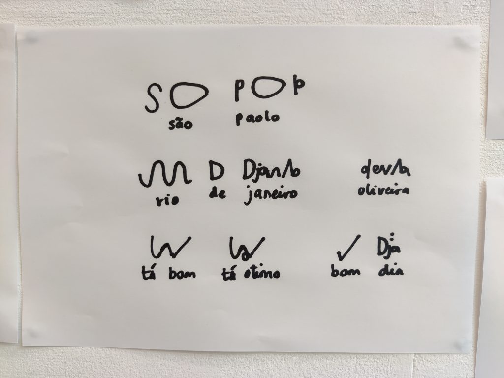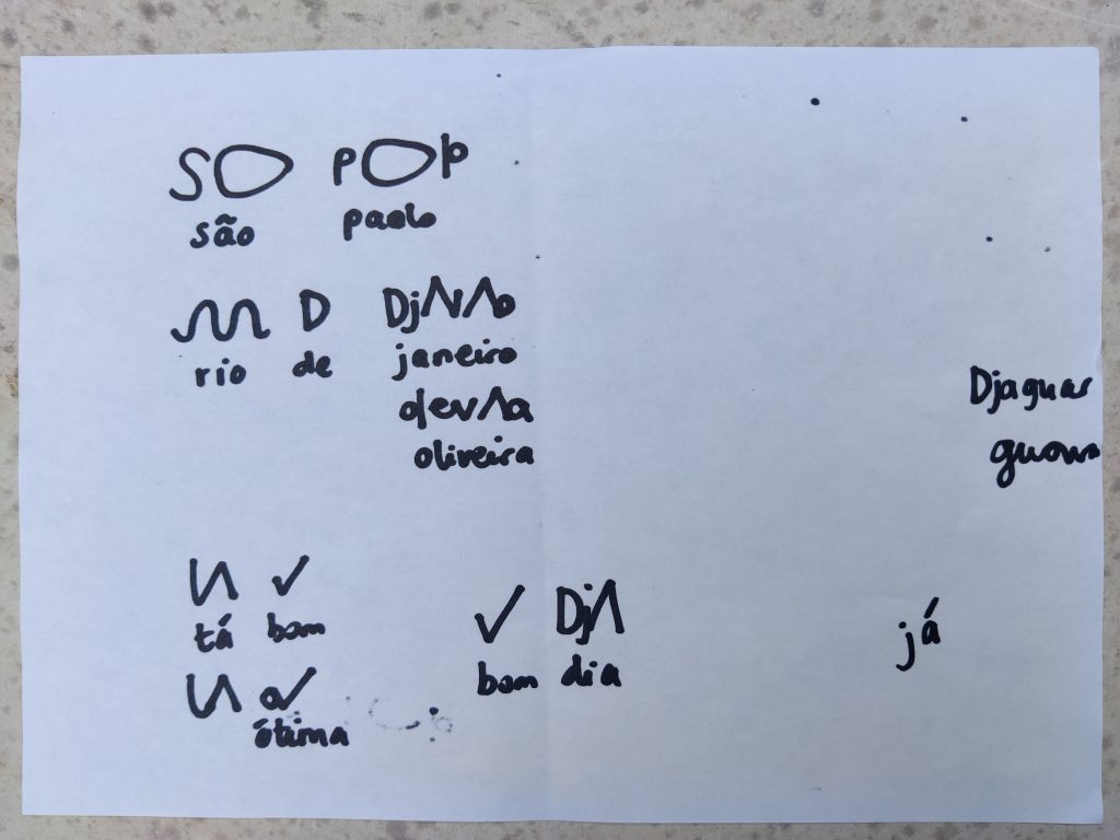Creating a new phonetic alphabet for Portuguese: I focused especially on common vowel sounds and their affiliated mouth shapes, like the shape and sound and form of “-ão” and suffixes like “-inha” and “-inho”, “-eira” and “-eiro”. In thinking about application for this visual shorthand, I considered how place-names in Brazil, like São Paulo and Rio De Janeiro might be re-represented in this new visual style.